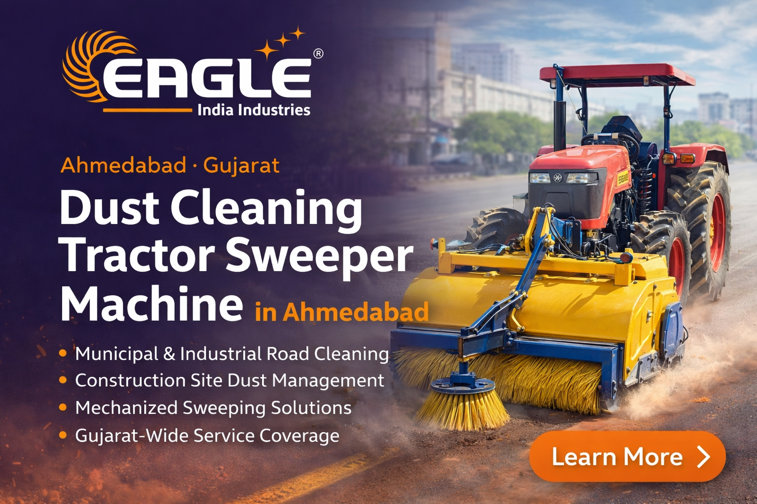 Ahmedabad is one of the major industrial and commercial centers in Gujarat. The city includes extensive industrial estates such as Vatva, Naroda, Odhav, Changodar, Sanand, and Kathwada, where regular road cleaning is essential for operational safety and hygiene. Industrial vehicles, construction materials, and logistics activities often generate dust, sand, and debris on roads. A tractor-mounted dust cleaning sweeper machine helps remove these contaminants effectively, ensuring cleaner surroundings and improved working conditions.